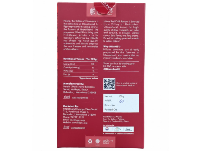 0 out of 5(0)Hilans Himalayan Red Chilli Powder is a pure, naturally sun-dried spice sourced from Dehradun. Prepared by Uttarakhand farmers, this chemical-free, fiery powder supports local women’s self-help groups.